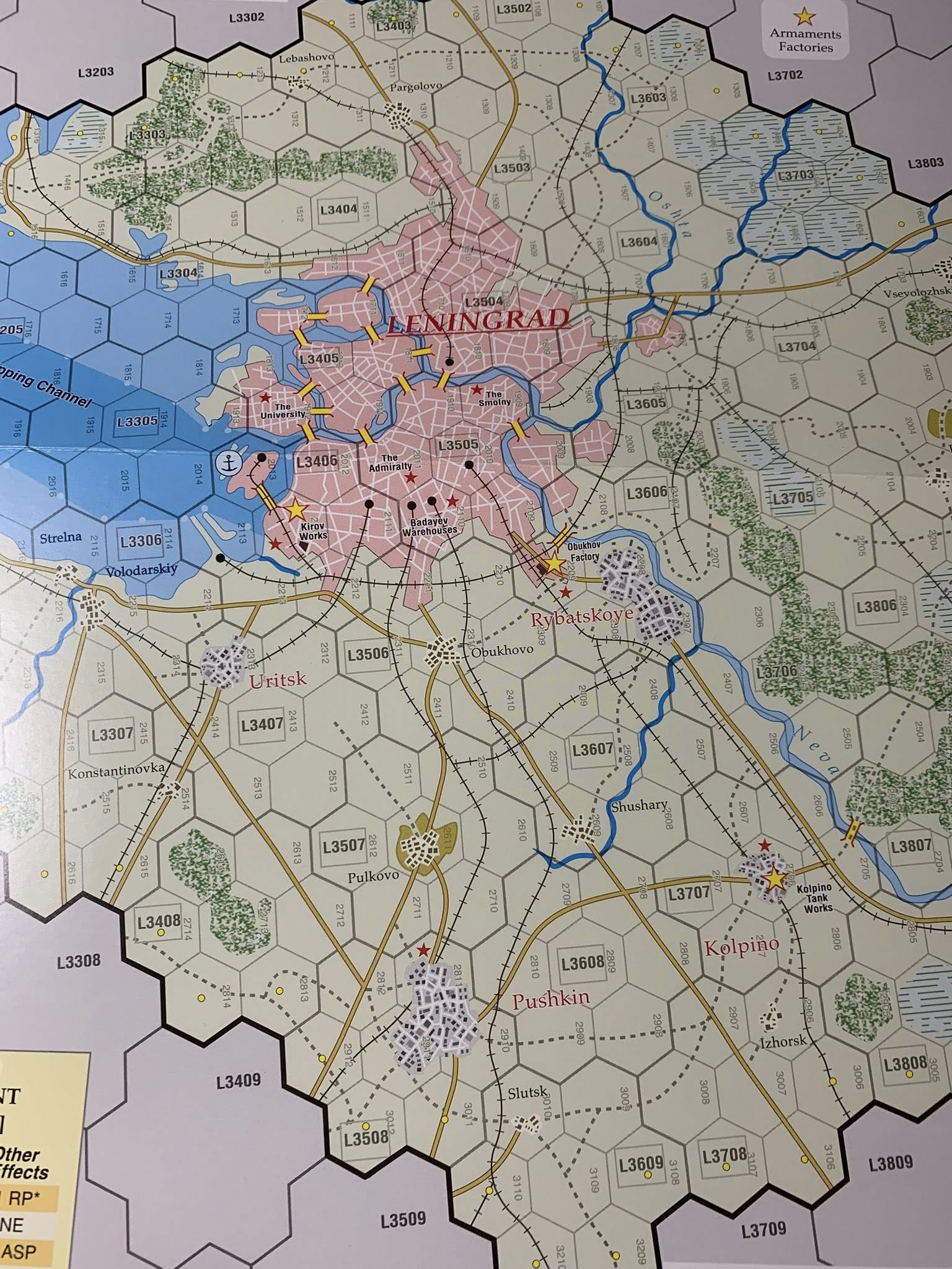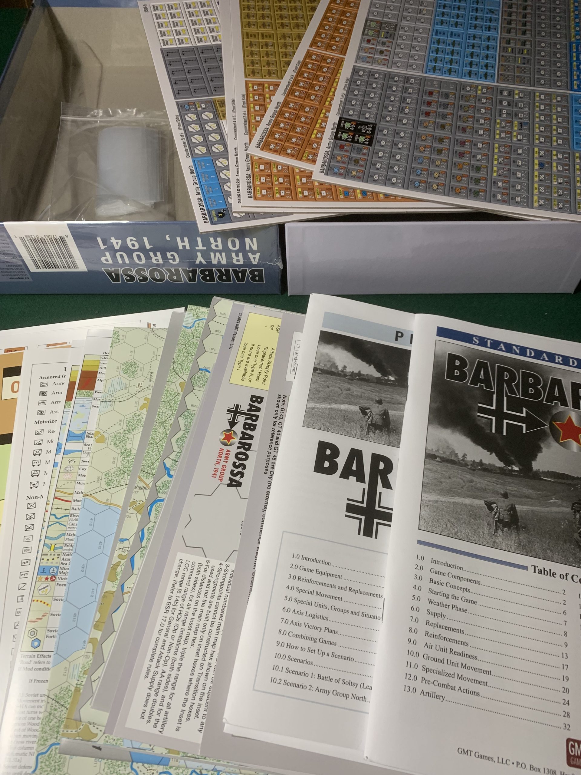 Di dimensioni superiori allo standard GMT, atta a contenere il numeroso materiale, specie dopo aver staccato le pedine e sistemate negli appositi contenitori. Molto belle le immagini di copertina, con foto storiche nel settore nord del fronte russo. Sul retro tutte le informazioni atte a illustrare il contenuto della scatola sulle quali capeggia l’immagine dell’intera mappa (in scala minore), impressionante. Interessanti le informazioni che riguardano la complessità (7) e la possibilità di gioco in solitario (7)! Oltre a questo ben in evidenza che il gioco si può giocare anche in team da 4; ottimo!